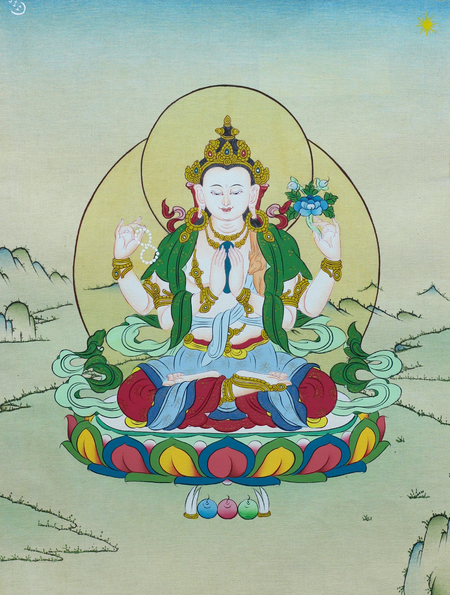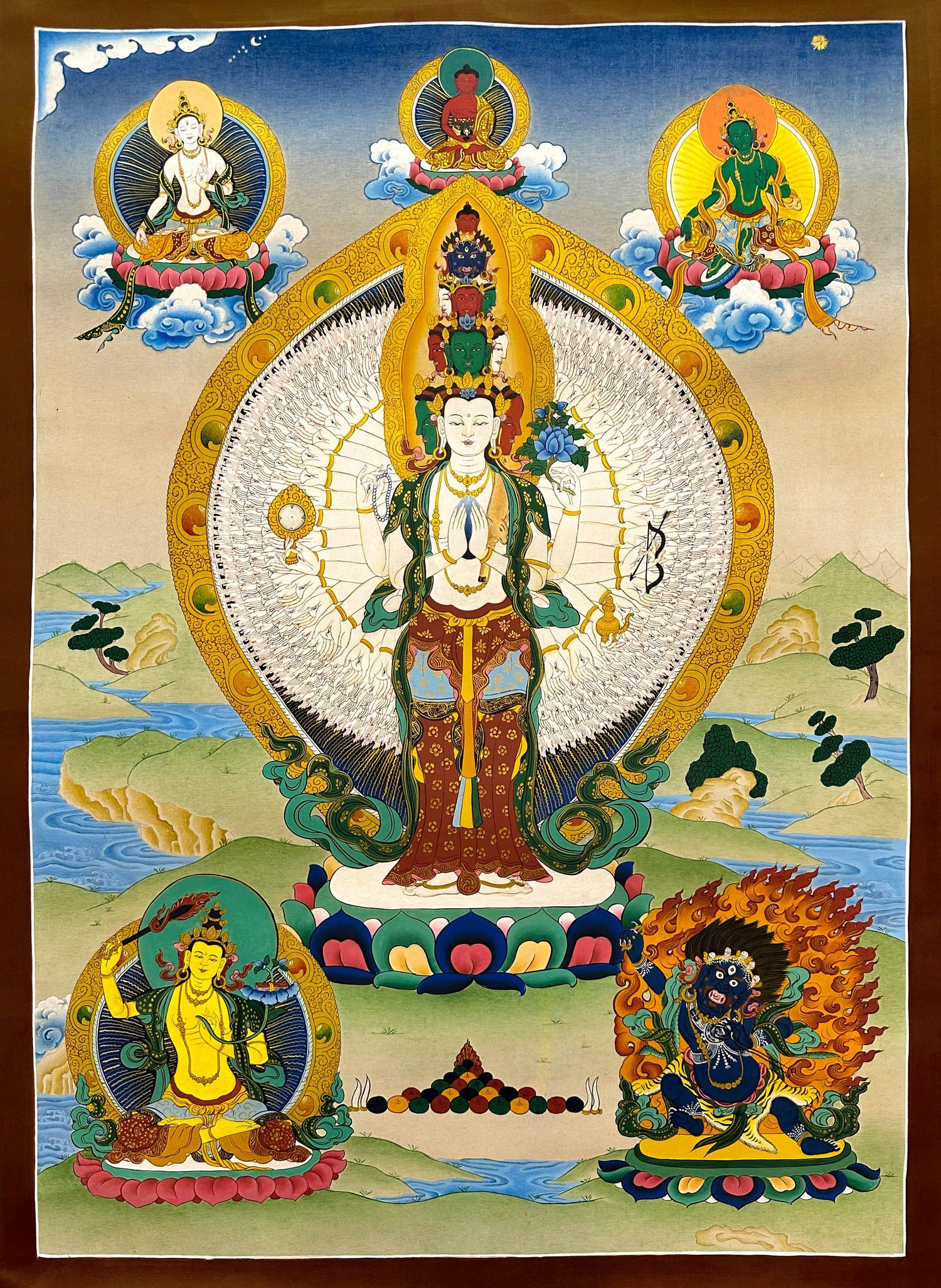 Embodying infinite compassion, Avalokiteshvara blesses practitioners with kindness and the power to alleviate suffering.