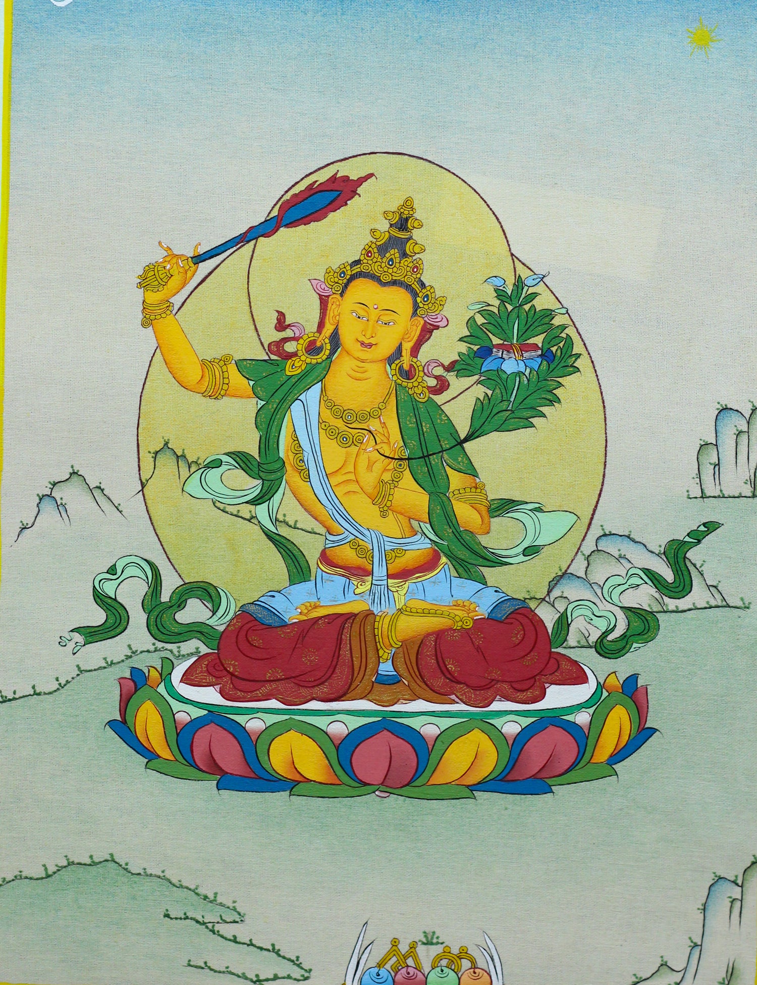 The Bodhisattva of wisdom, Manjushri dispels ignorance and sharpens insight for clarity on the path of truth.