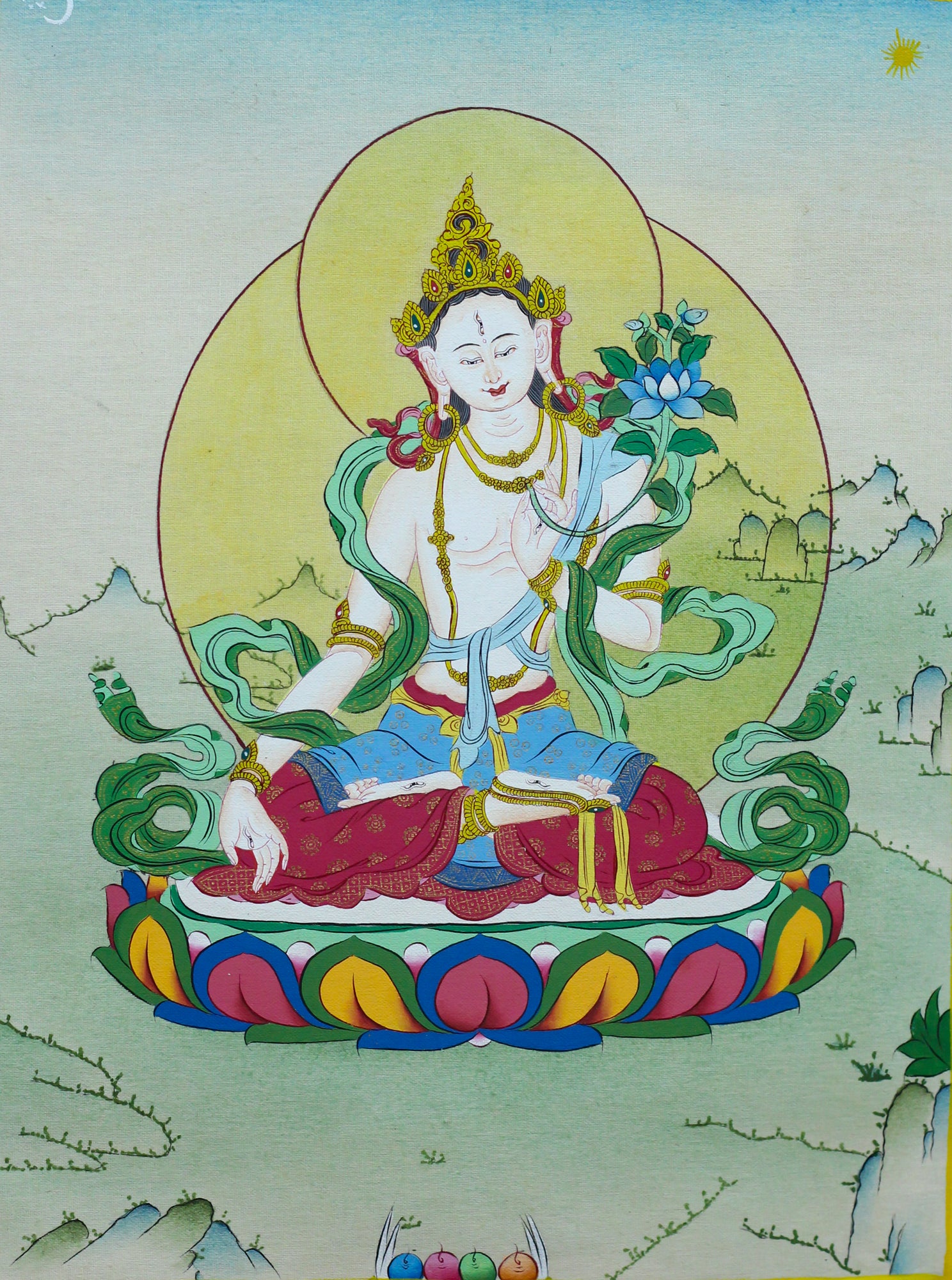Known for healing and longevity, White Tara radiates motherly compassion and grants vitality, peace, and protection.