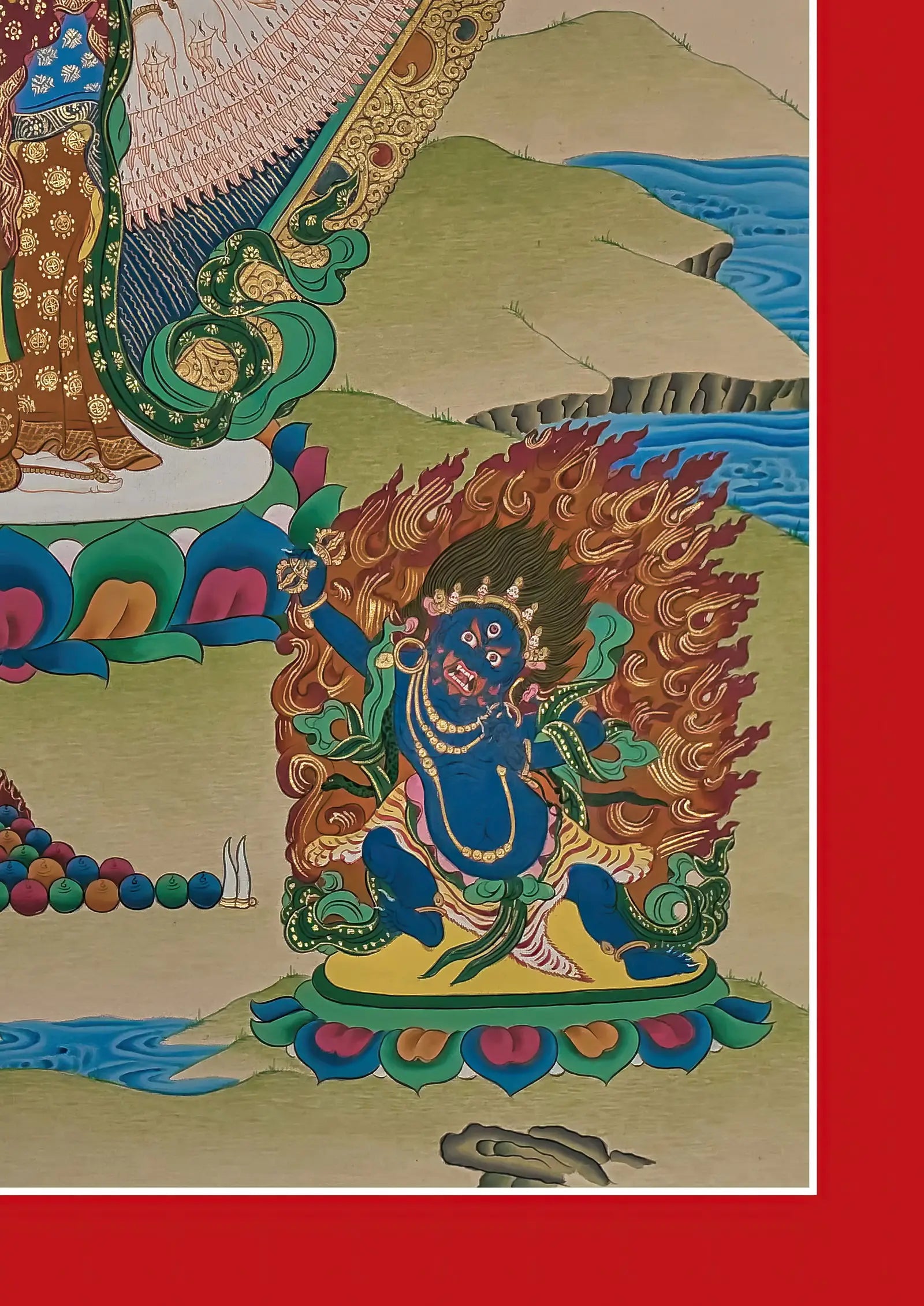 - Mahakala at the bottom right – wrathful protector, fiercely guarding against obstacles and negativity.