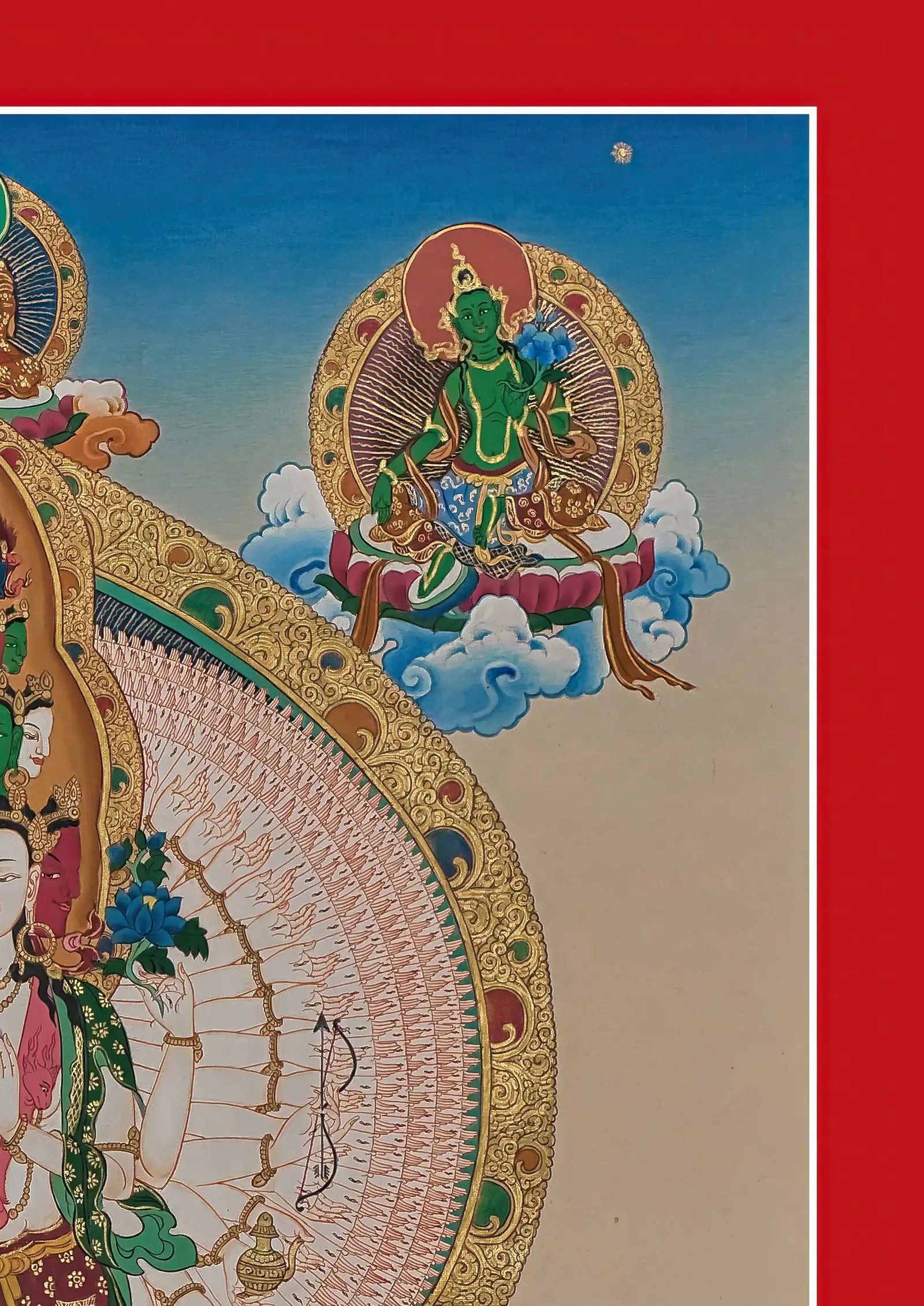 This Thousand-Armed Avalokiteshvara thangka unites compassion, healing, prosperity, and protection—making it a powerful spiritual centerpiece to bless your home, support meditation, and invite peace, abundance, and safeguarding energy.