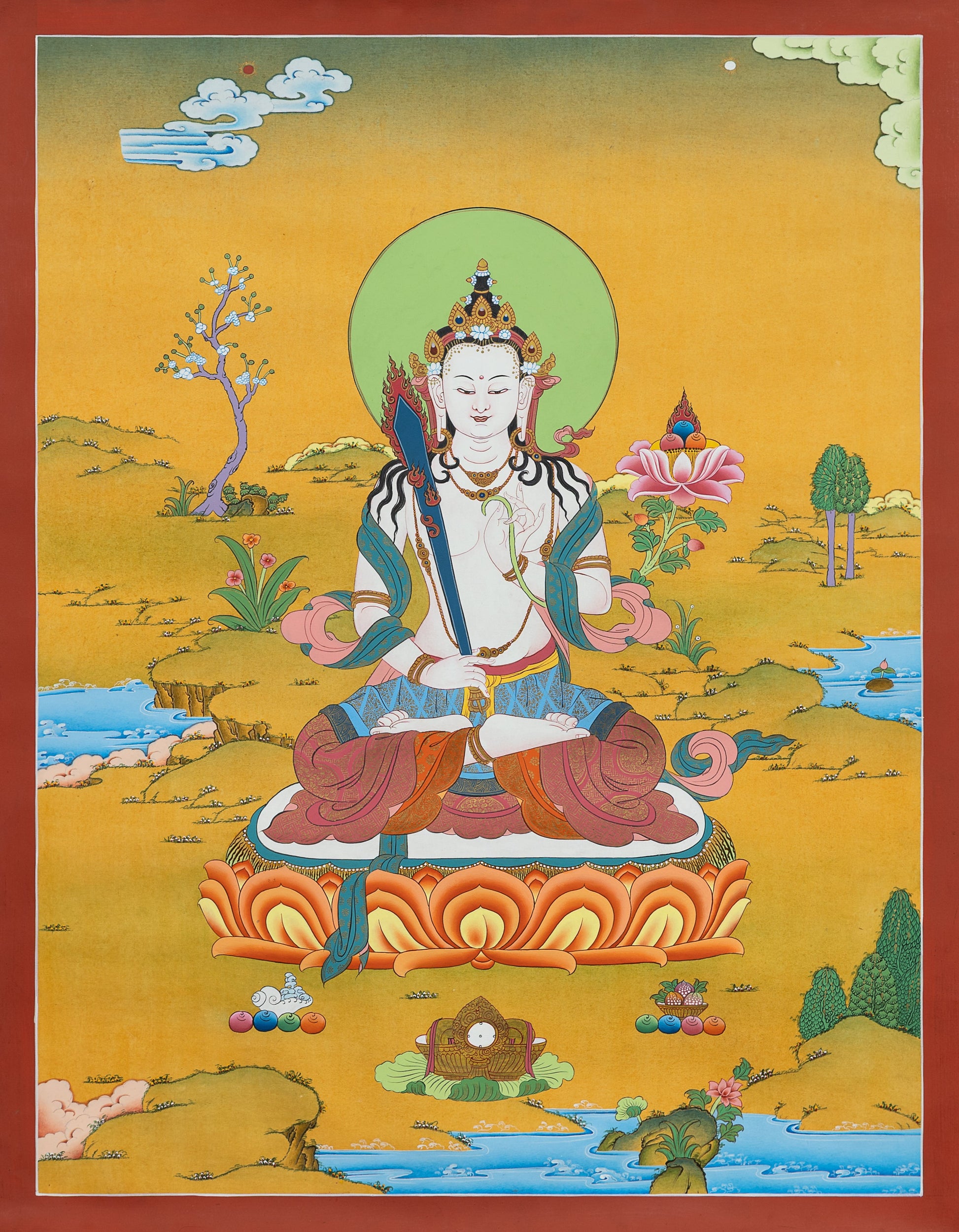 This beautiful Aakash Garva thangka measures 18x24 inches. A hand-painted masterpiece on cotton canvas, traditionally used for meditation and spiritual practice.
