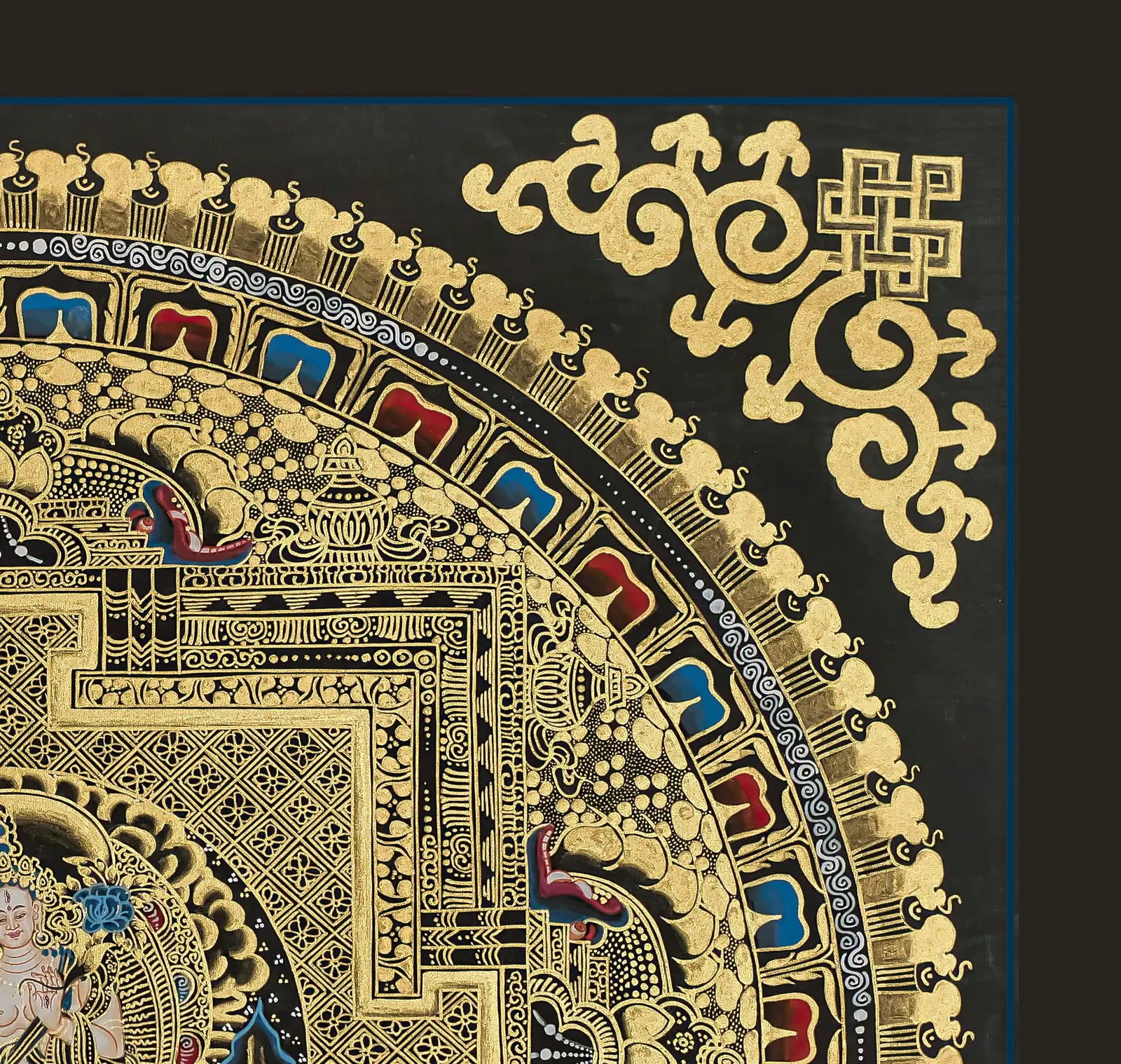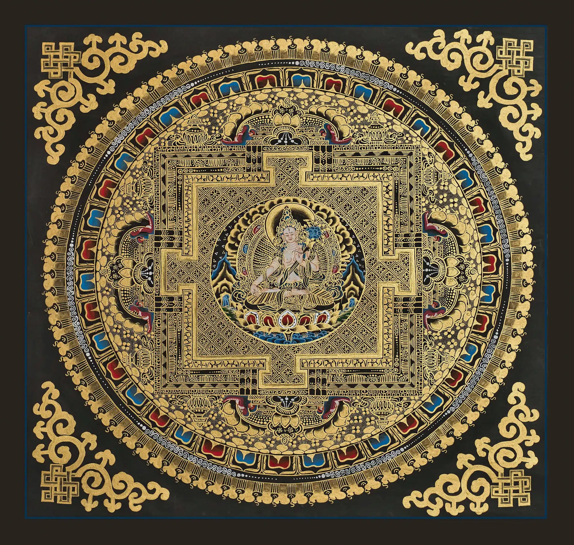 This Black and Gold Mandala features White Tara in the center. She is a Bodhisattva associated with longevity, healing, and compassion.