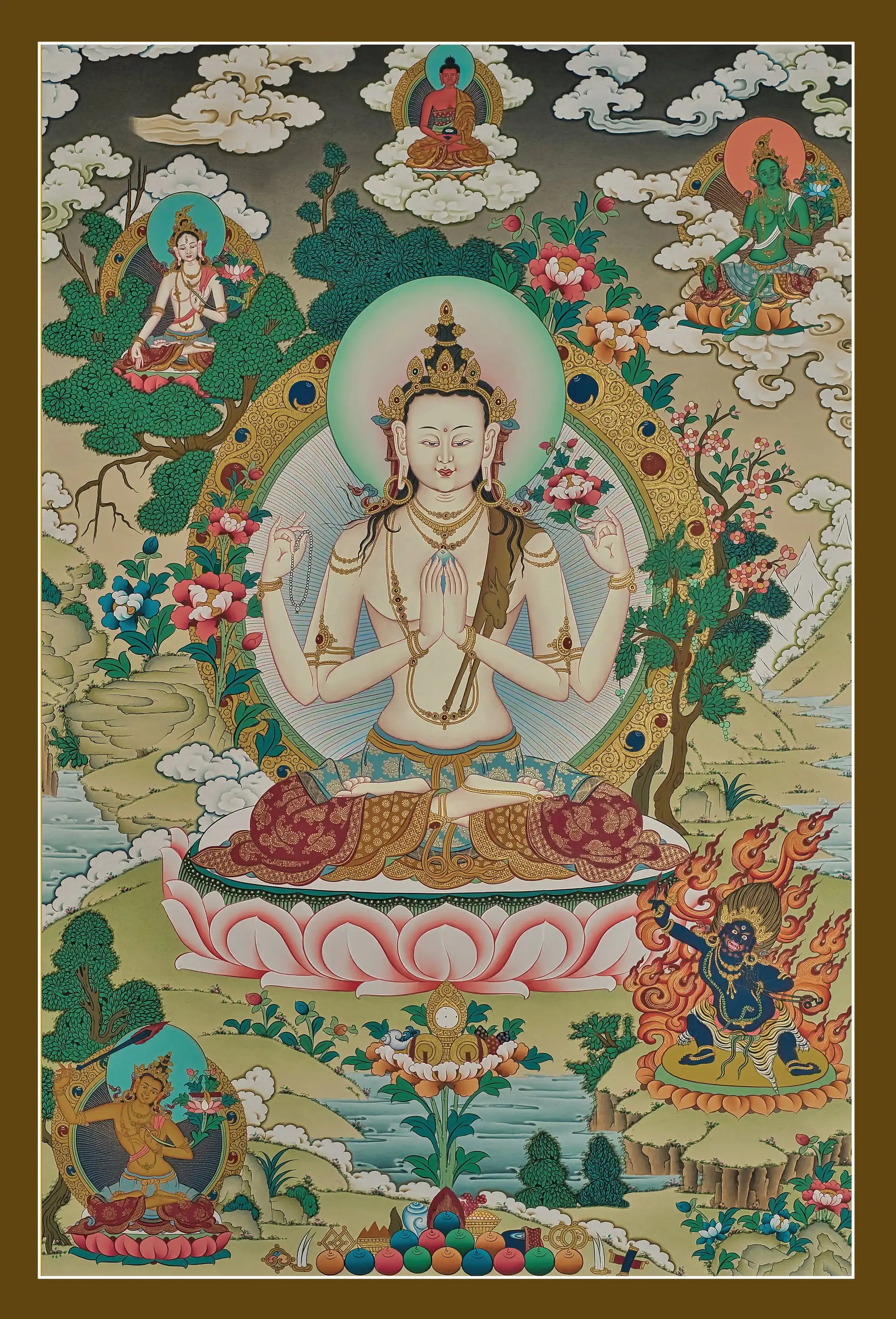 Chenrezig Thangka with Amitabha, Green Tara and Other Deities - (20" * 30")