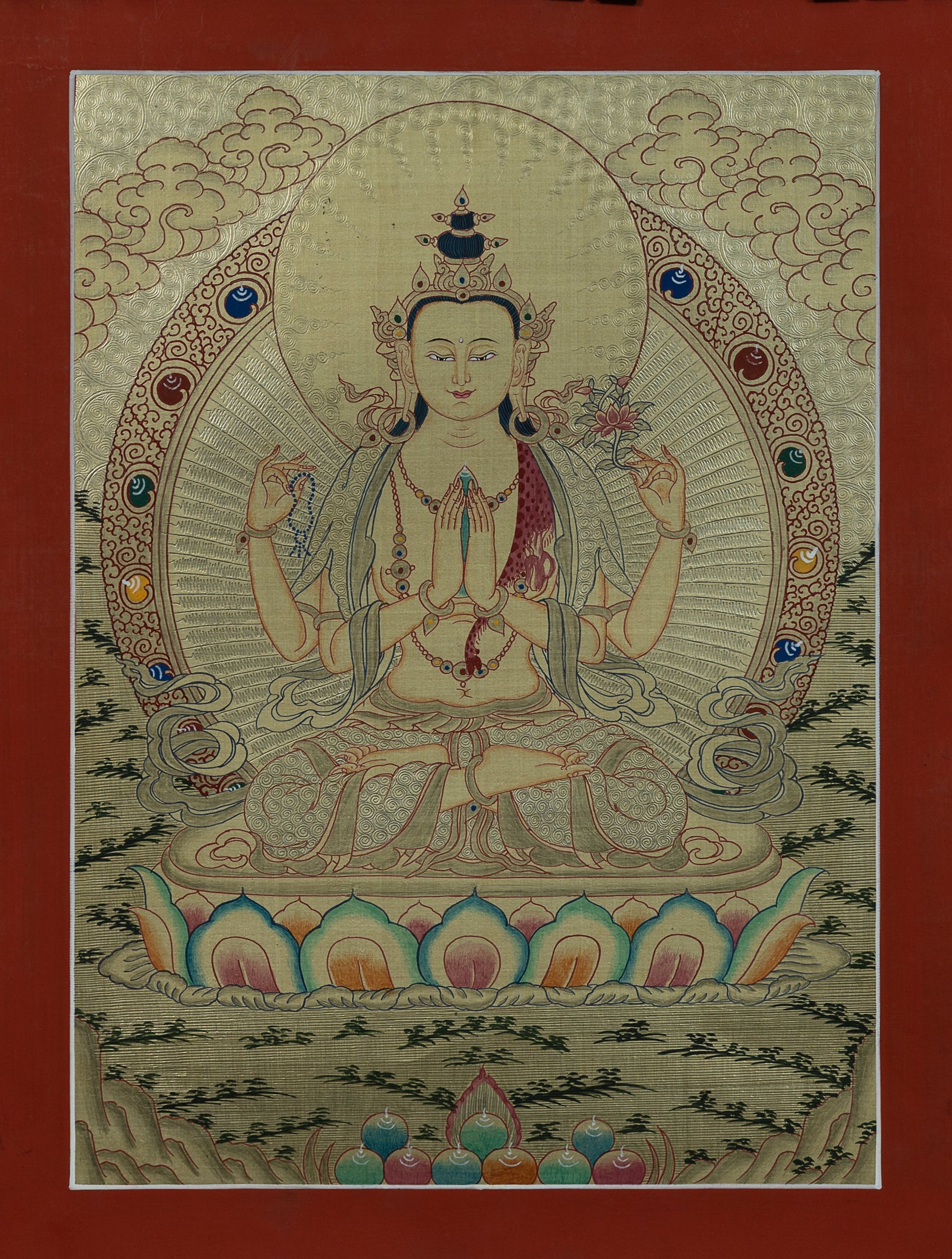 This beautiful Chenrezig thangka measures 11x15 inches. A hand-painted masterpiece on cotton canvas, traditionally used for meditation and spiritual practice.