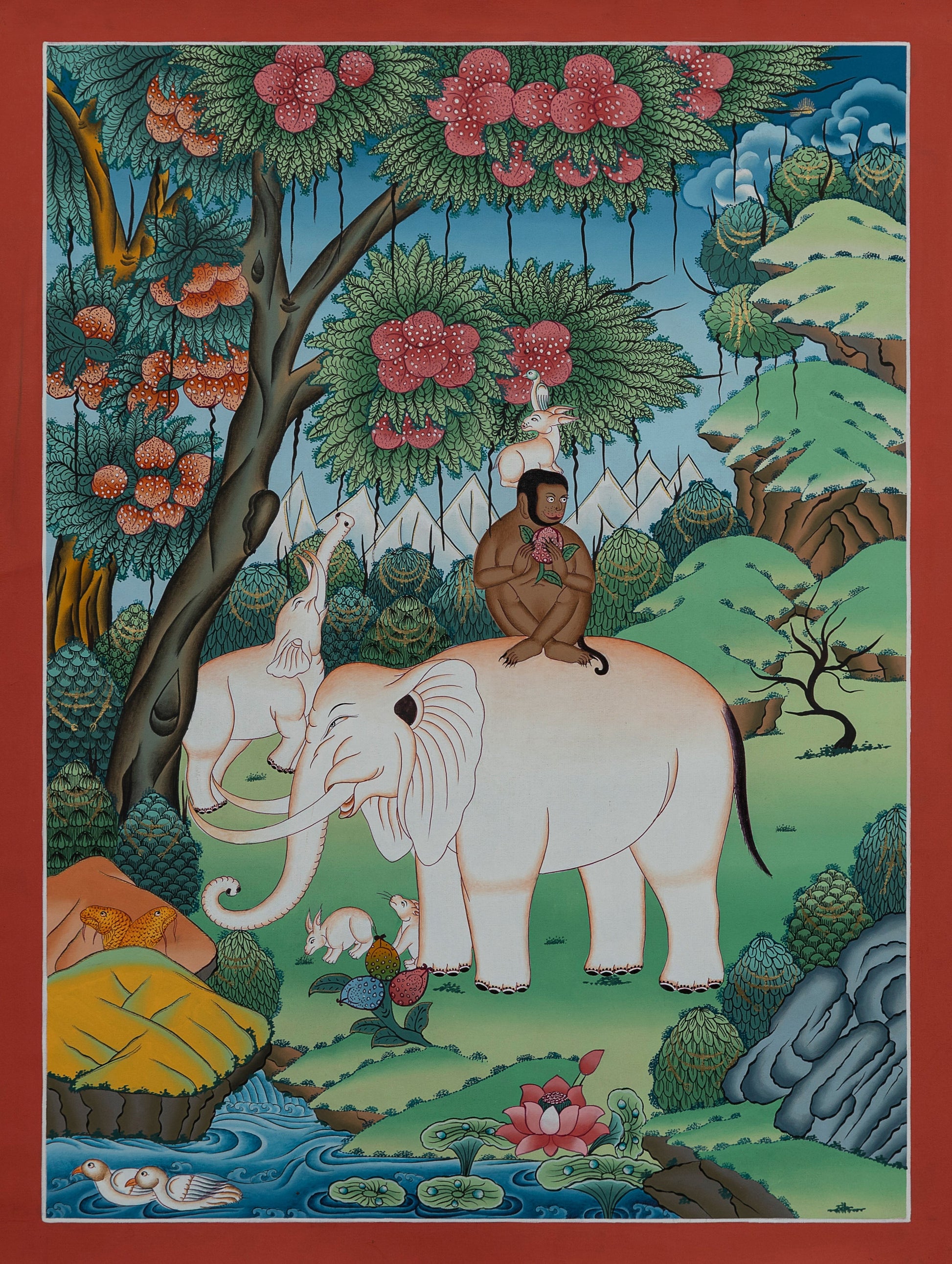 This beautiful Four Harmonious Friends thangka measures 14x20 inches. A hand-painted masterpiece on cotton canvas, traditionally used for meditation and spiritual practice.