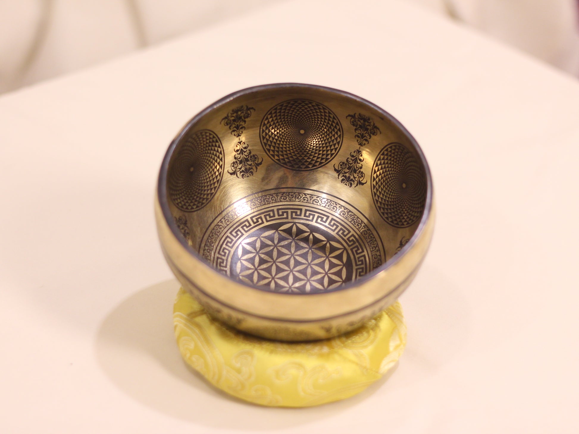 The rich, golden finish provides a stunning backdrop for the detailed etching, creating a piece that is as much a work of art as it is a powerful sound healing tool. The harmonic tones produced by this bowl are ideal for deepening meditation, yoga, Reiki, and creating a sacred space for personal growth.