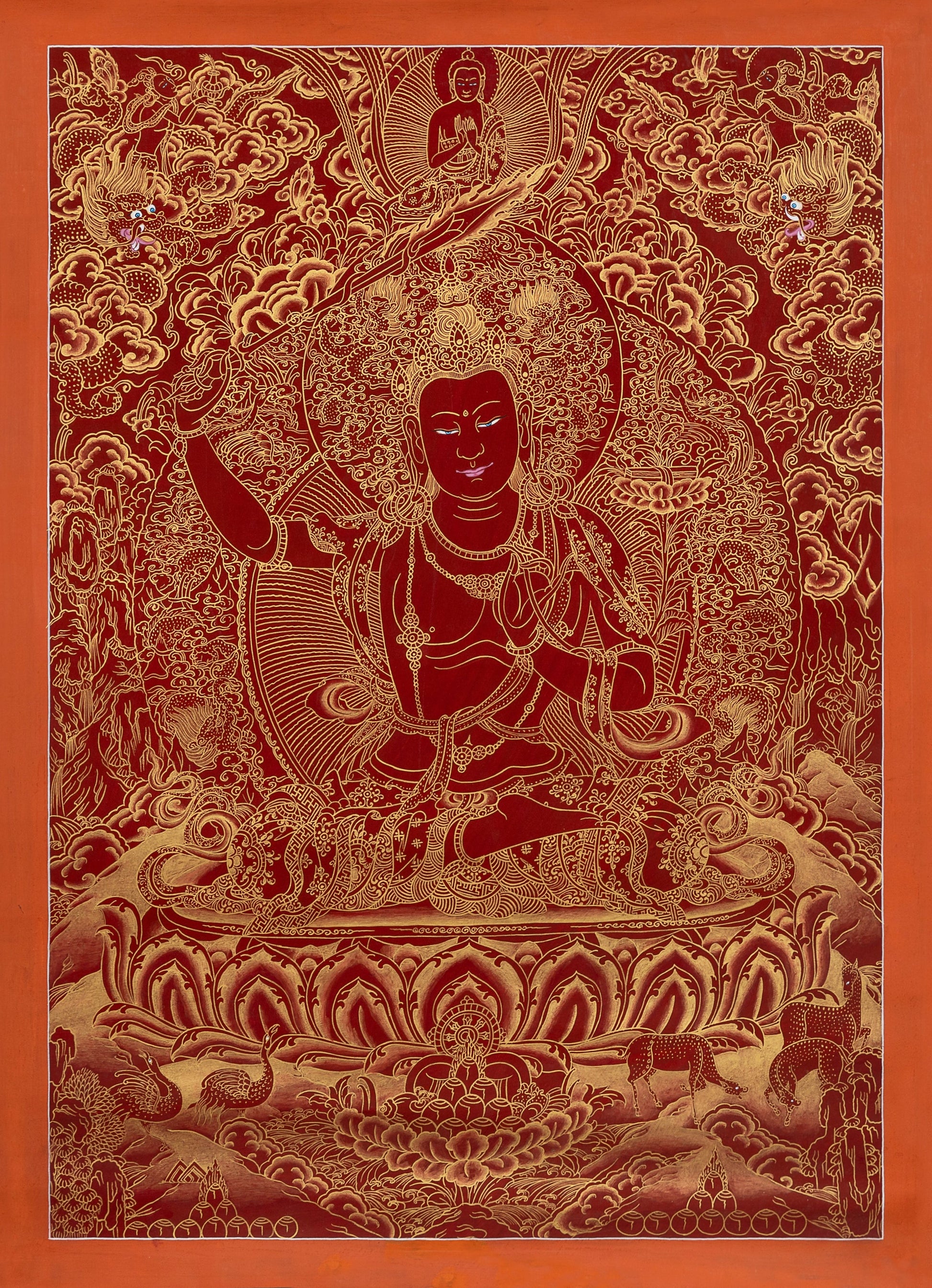 This beautiful Manjushree thangka measures 17x24 inches. A hand-painted masterpiece on cotton canvas, traditionally used for meditation and spiritual practice.