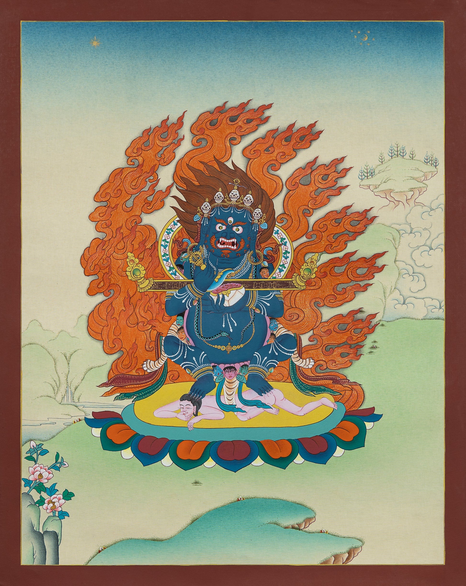 This beautiful Two Arm Mahakala thangka measures 15x20 inches. A hand-painted masterpiece on cotton canvas, traditionally used for meditation and spiritual practice.