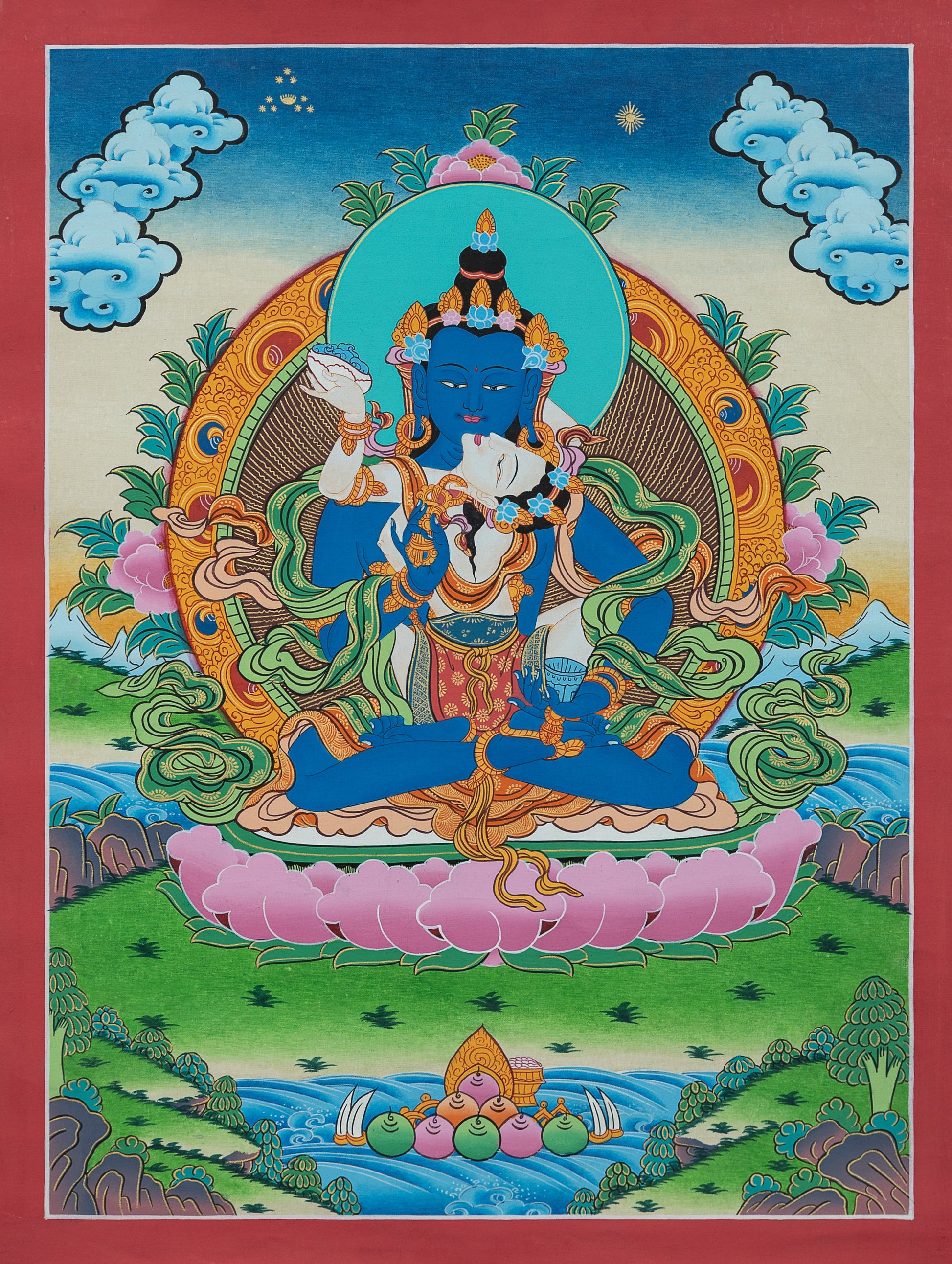 This exquisite Vajradhara thangka presents the Adi-Buddha (first Buddha) in a composition that emphasizes his role as the embodiment of the Dharmakaya - the truth body of all Buddhas. The artist has skillfully rendered the intricate details of the vajra and ghanta (bell), symbols of skillful means and wisdom in perfect union. The rich lapis lazuli blue pigment symbolizes the boundless nature of reality, while the gold highlights create a radiant effect around the figure. This thangka is highly revered in all Tibetan Buddhist traditions as the representation of the ultimate source of enlightenment and the teachings of tantra.