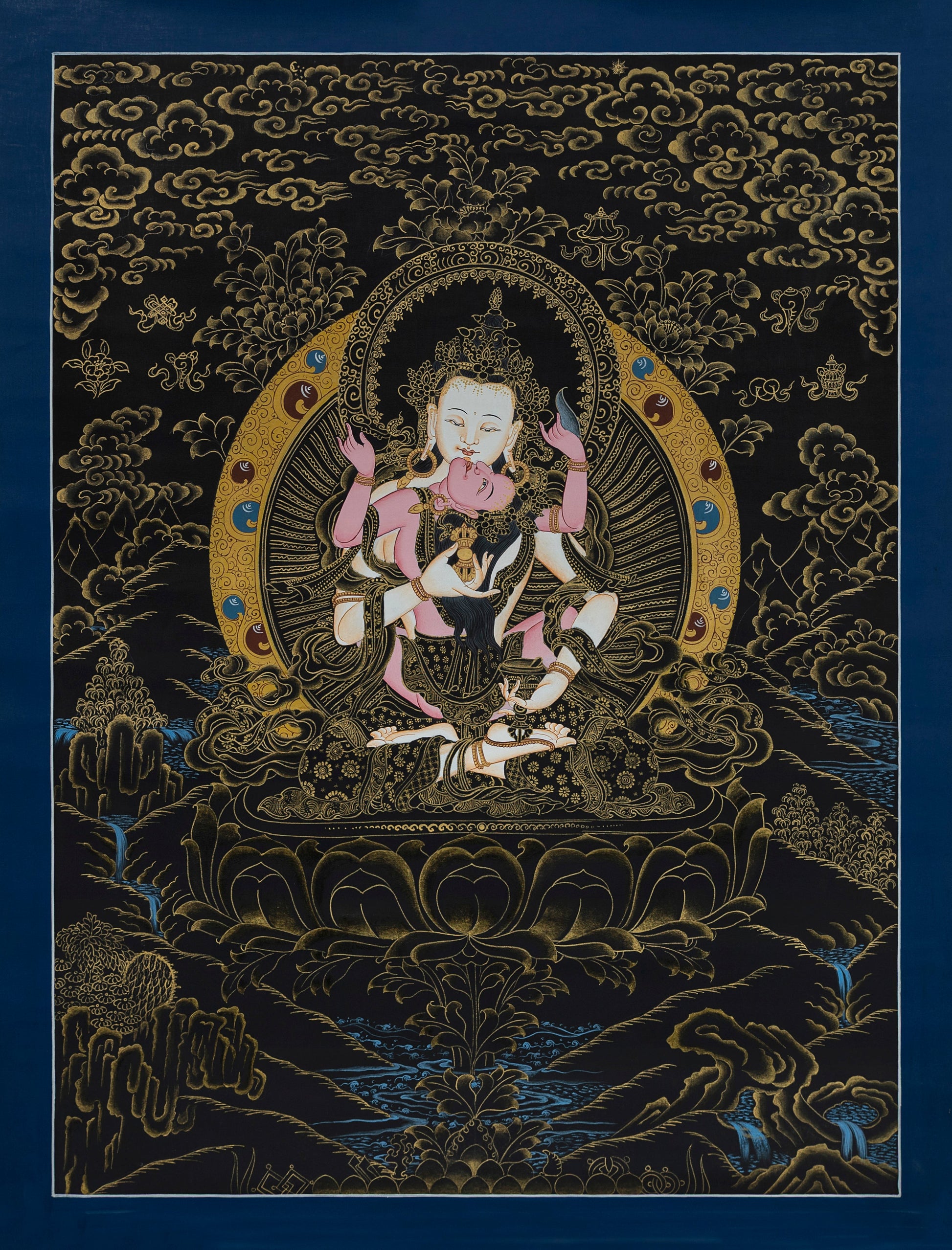 This beautiful Vajrasattva with Consort thangka measures 18x24 inches. A hand-painted masterpiece on cotton canvas, traditionally used for meditation and spiritual practice.